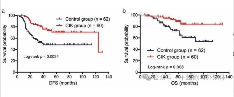 研究結果表明,CIK組1年、2年、3年、4年和5年無病生存(DFS)率分別為98.3%、85.8%、80.2%、73.6%和70.7%,對照組分別為85.5%、61.0%、52.4%、48.3%和48.3%。使用CIK聯(lián)合治療,無病生存率顯著提高,5年無病生存比率提升22.4%!CIK組的1年、2年、3年、4年和5年總生存(OS)率分別為98.3%、98.3%、96.5年、92.0年和88.7%,對照組分別為98.4%、93.4%、84.2%、75.0年和72.4%。使用CIK聯(lián)合治療,總生存率顯著提高,5年無病生存比率提升16.3%!