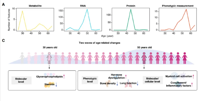 具體來說,人類會(huì)在34歲、60歲和78歲,分三次迎來“衰老的質(zhì)變”—也就是「斷崖式衰老」。在這個(gè)時(shí)候,你可能會(huì)發(fā)現(xiàn)皺紋突然“野蠻生長(zhǎng)”,而疾病也開始頻繁“作祟”。