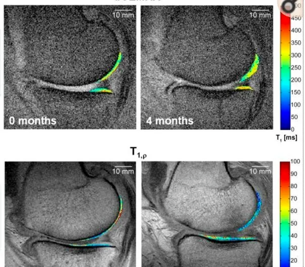 如下圖,MRI顯示顏色越藍,代表軟骨質量越好,說明修復良好。另外,臨床試驗過程中沒有發現不良反應。