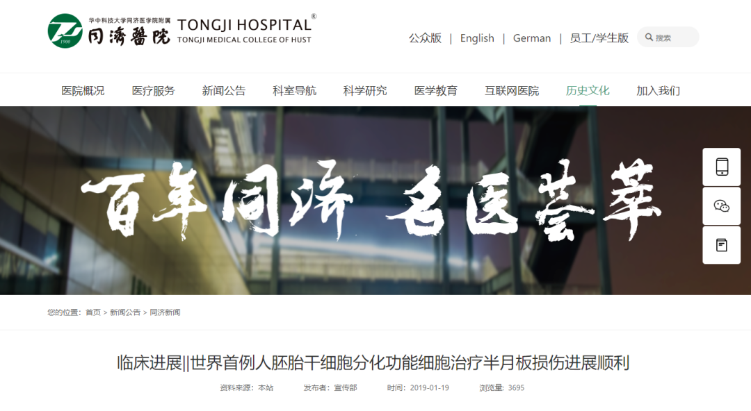 2019年1月9日,世界首例人胚胎干細胞分化功能細胞治療半月板損傷在華中科技大學同濟醫學院附屬同濟醫院康復醫學科順利完成。