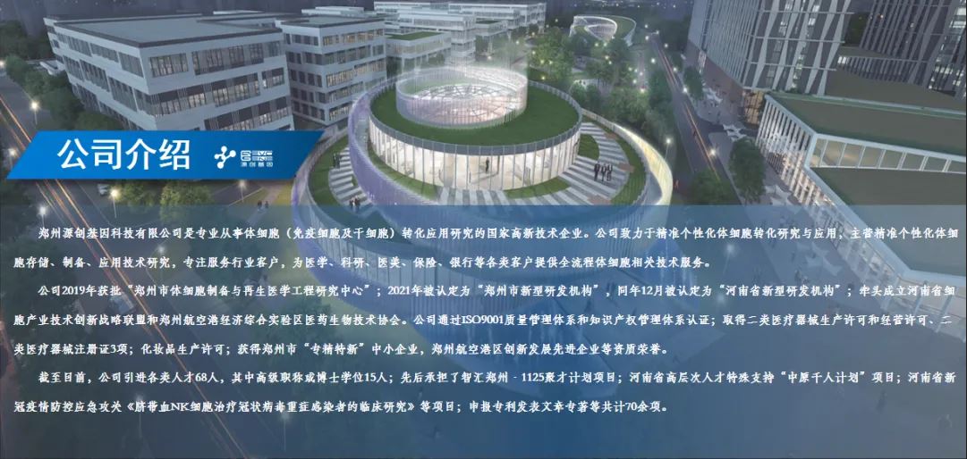鄭州源創基因科技有限公司成立于2016年,由哥倫比亞大學博士后趙輝,歸國創辦的國家高新技術企業。擁有97項知識產權及實用技術,業務遍布上海、重慶、深圳、北京等城市,總部在鄭州航空港區。