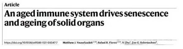 2021年,美國明尼蘇達大學醫學院的研究人員在《Nature 》雜志上發表了名為《An aged immune system drivessenescence and ageing of solid organs》的研究。