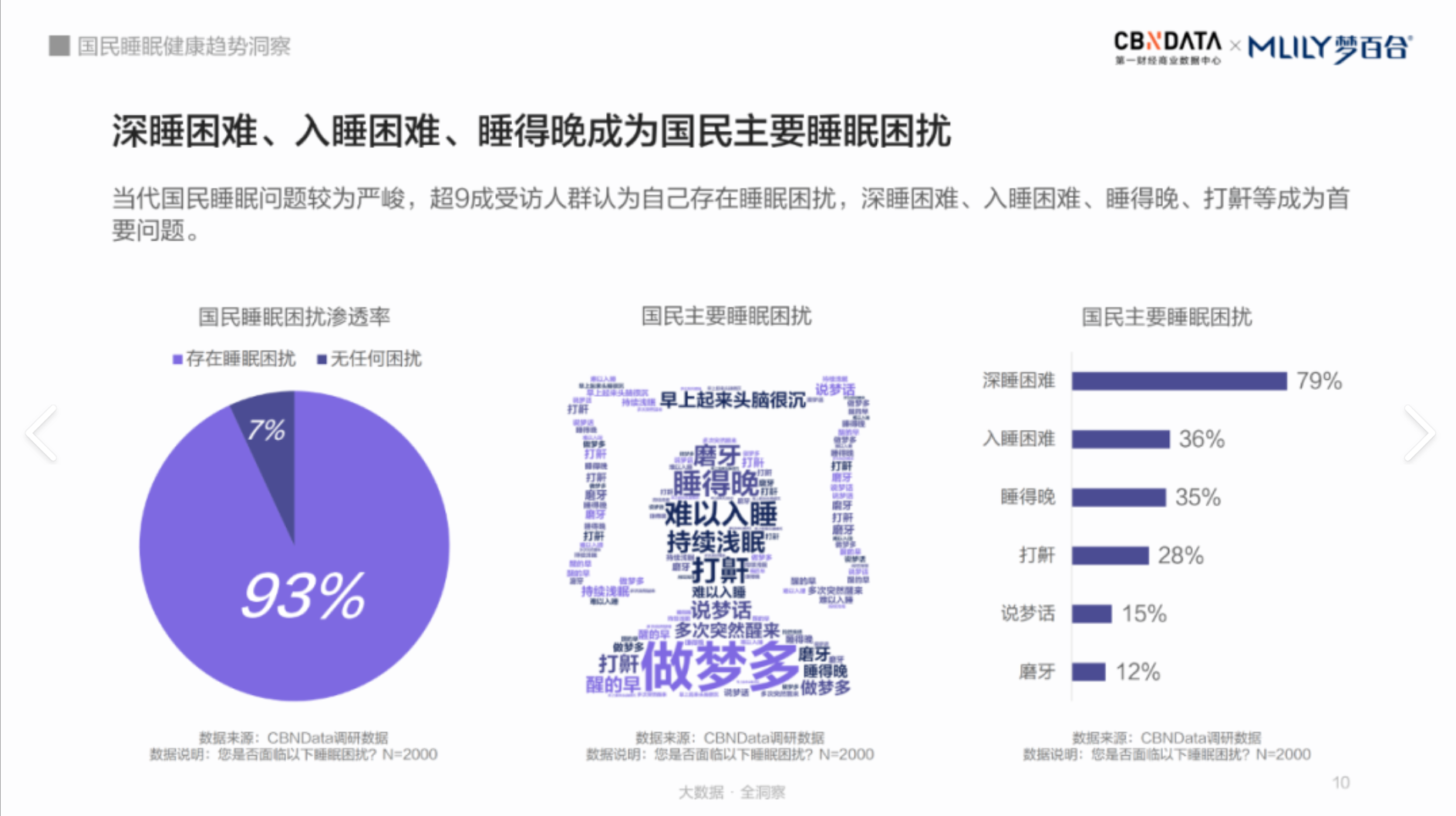 調查顯示,超過3億人口正面臨睡眠障礙問題,平均每10個人中就有1人受此影響。睡眠障礙中最常見的問題是睡眠不深、難以入睡和睡得晚。對年輕人來說,長期失眠不僅會影響白天的精神狀態,還可能影響工作和生活效率。對于年長者來說,他們的困擾則更多集中在睡眠狀態本身,如難以深度睡眠、醒來后難以再次入睡、做夢多、打鼾等問題。