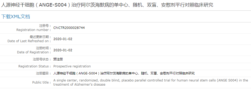 此外,在中國臨床試驗注冊中心也有干細胞治療老年癡呆的項目注冊,例如《人源神經干細胞(ANGE-S004)治療阿爾茨海默病的單中心、隨機、雙盲、安慰劑平行對照臨床研究》(ChiCTR2000028744 )。同時,國內還有《宮血干細胞治療輕度阿爾茨海默病的安全性和初步有效性的臨床研究》完成備案。